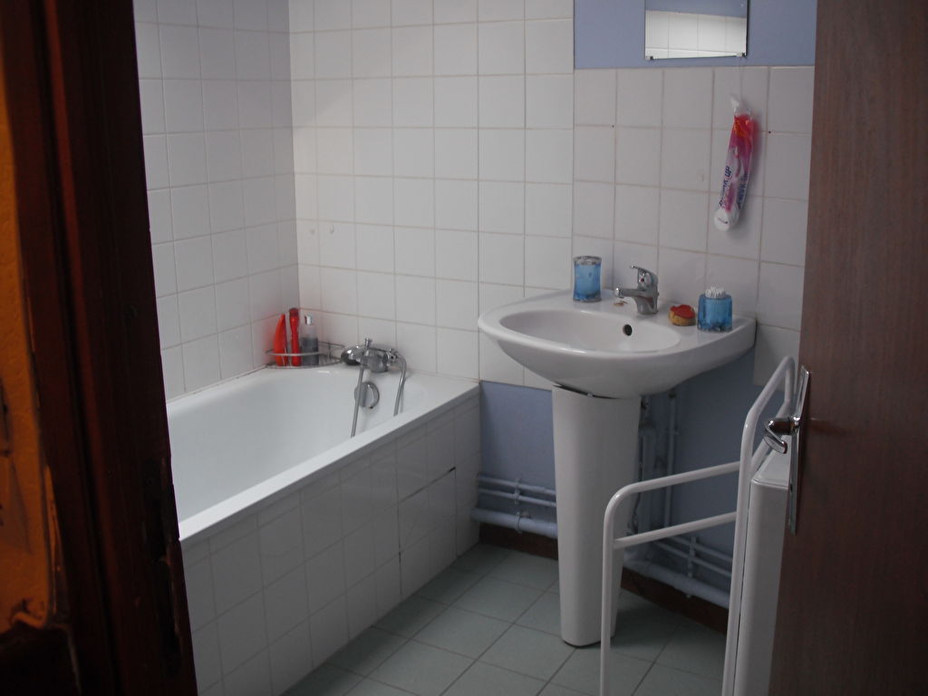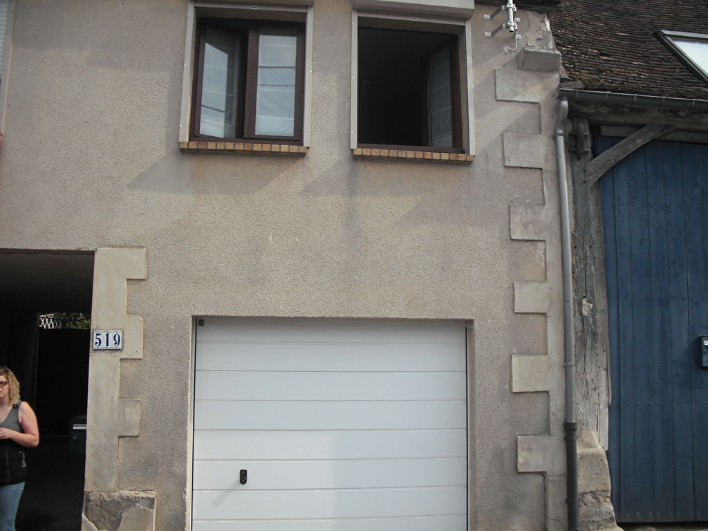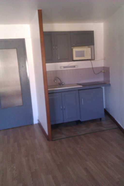 Appartement T2 avec grand garage offrant : entrée, a l'étage beau séjour avec coin cuisine équipée ( plaques, hotte, four micro ondes) chambre, salle de bains, wc. Chauffage électrique. DISPONIBLE 17/12/2021 .