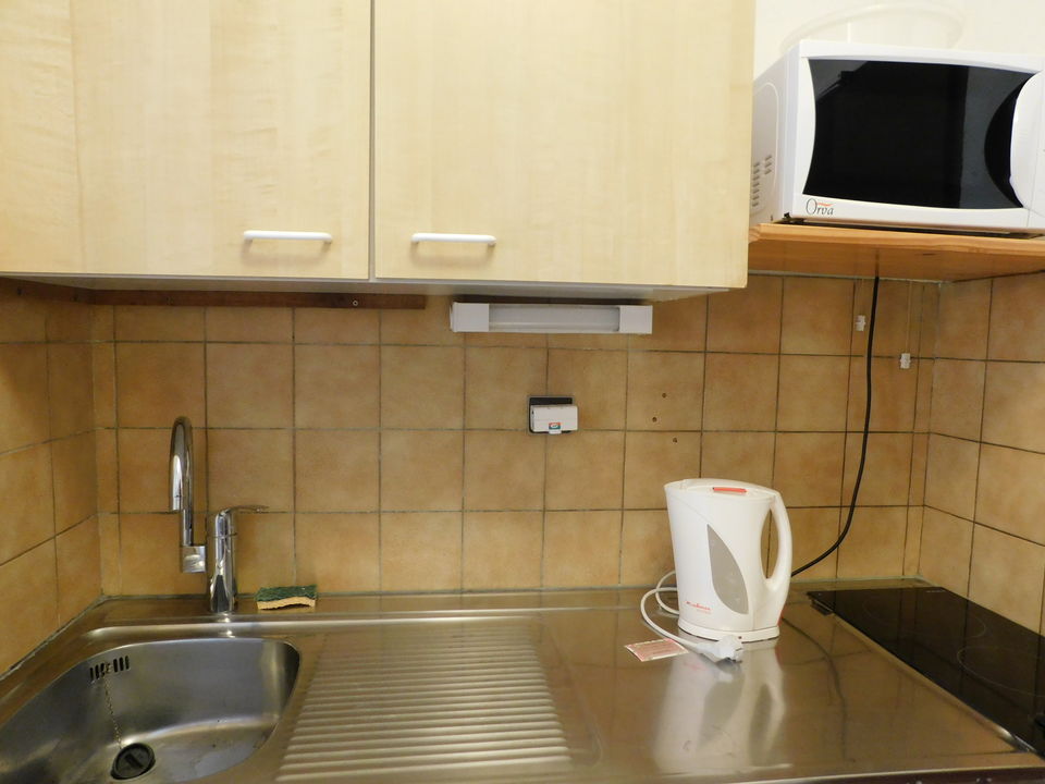 Une cuisine séparée de 6.29 m2 avec 2 plaques vitro, mini-four, micro-onde, réfrigérateur, cocotte-minute, ustensiles de cuisine, cafetière électrique, grille-pain, fer à repasser, planche à repasser, aspirateur, etc