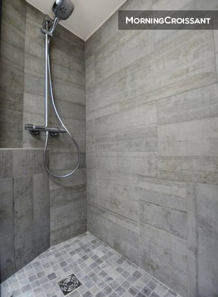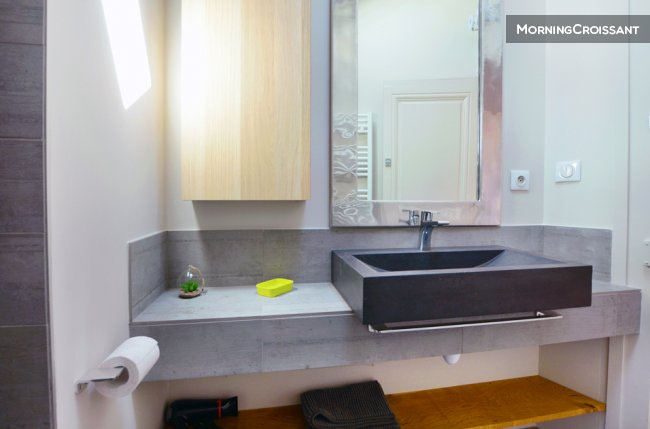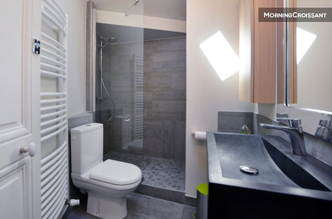 Salle de bain : douche à l’italienne, vasque sur meuble, toilettes.