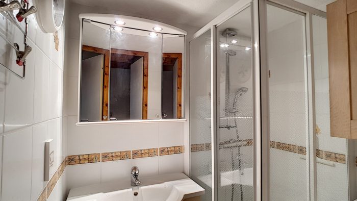 -Une salle d'eau avec lavabo, douche, et machine à laver