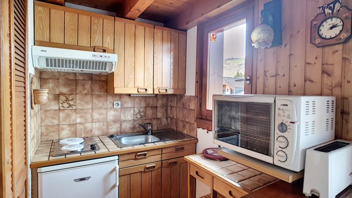-Un coin cuisine avec placard (réfrigérateur, four, plaque électrique)