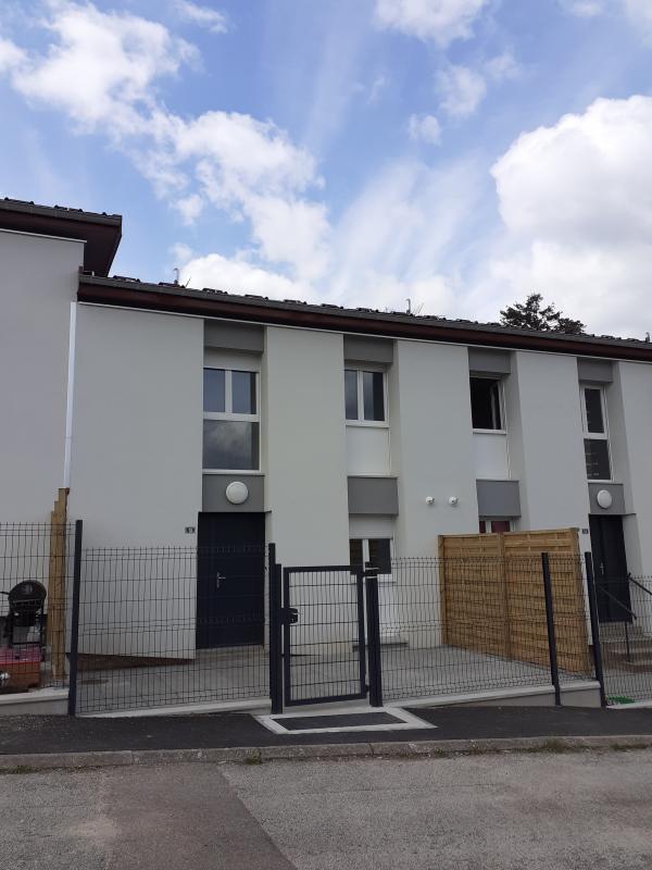 Appartement en duplex avec terrasse privative et garage séparé. En rez de chaussée : entrée, cuisine, séjour, WC, buanderie, à l'étage : 3 chambres et salle de bains.
